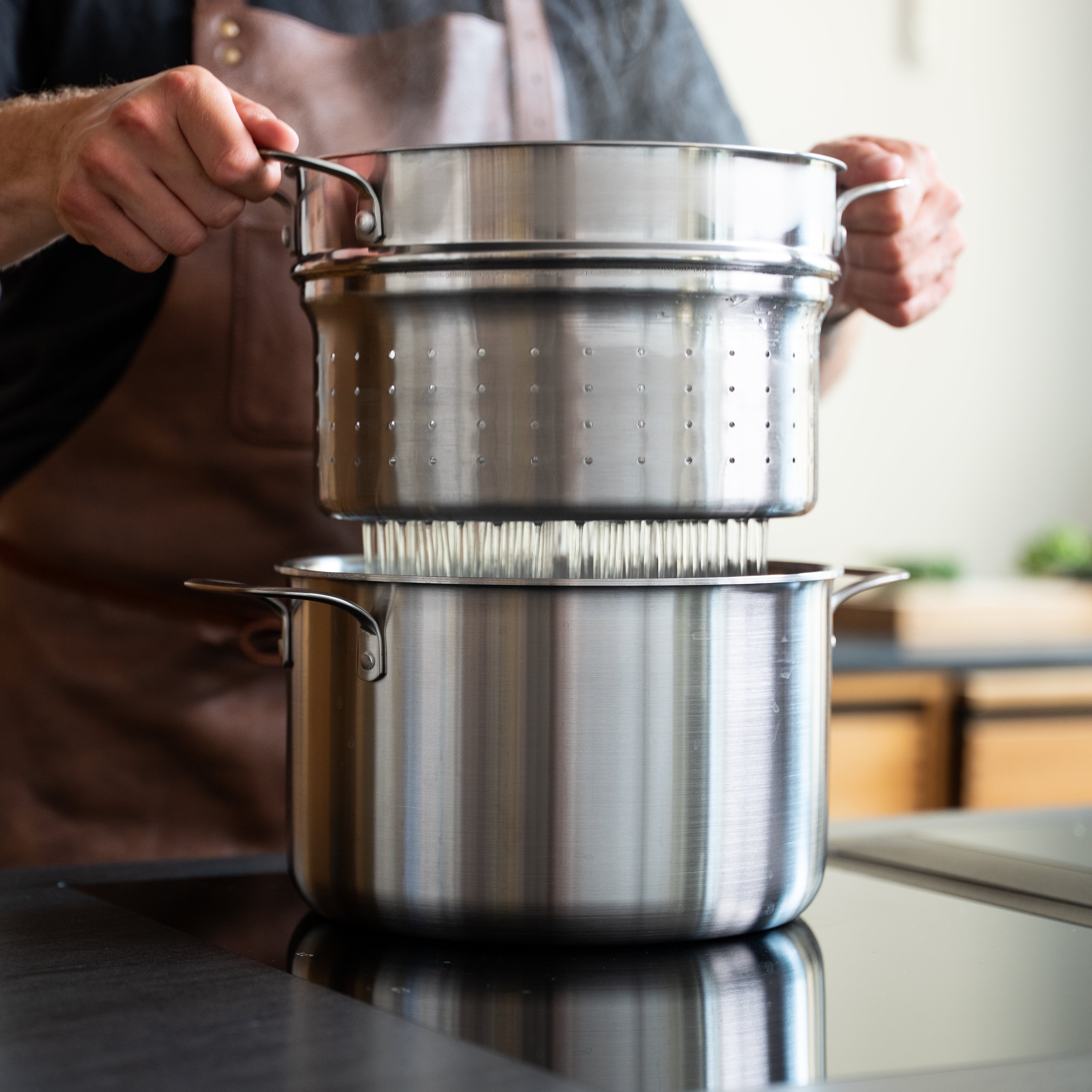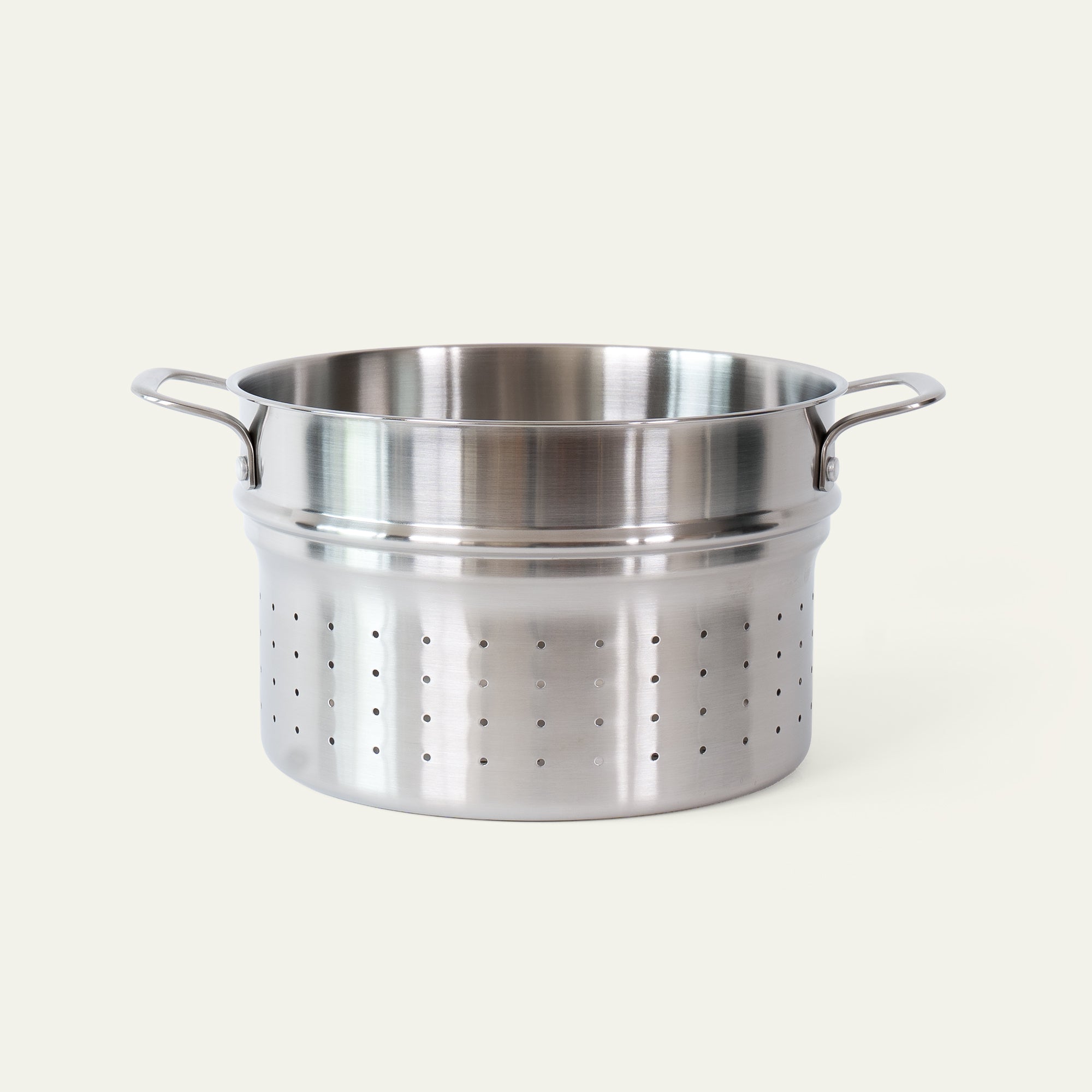 The insert is made in Italy by the same family-owned company that makes our 5-ply cookware. It is designed to fit perfectly in our large 5-ply pot, and the many small holes ensure that the pasta stays where it should. But the insert isn't just for pasta: use it to blanch asparagus, cook potatoes, or boil large quantities of eggs. And with its stainless steel construction, the pasta insert is both durable and easy to maintain.