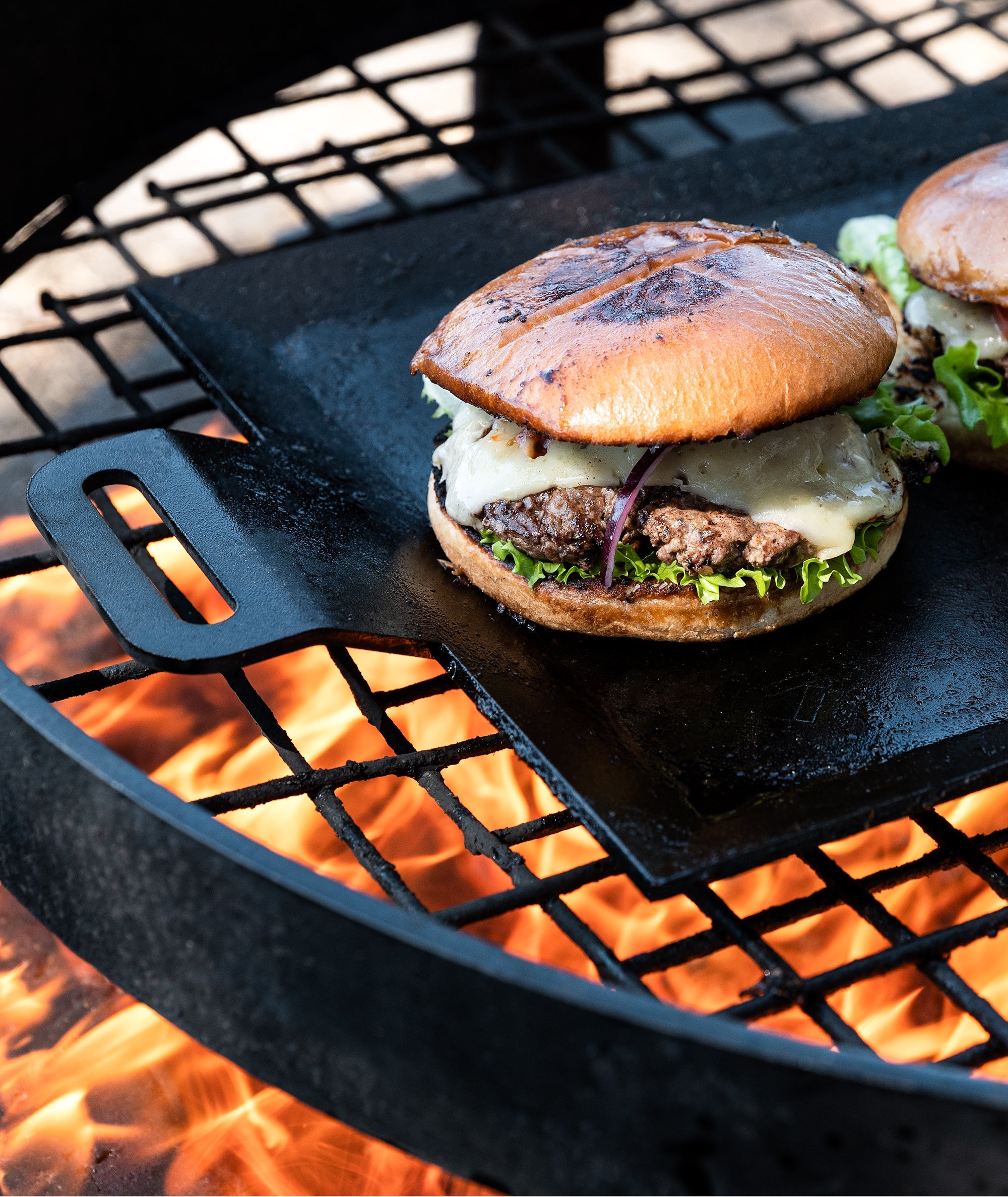 The cooking plate is lightweight enough for easy transfer from stovetop to grill, and it fits across two burners, allowing for dual heating zones. Inspired by professional kitchens, unlike a ridged grill pan, it offers maximum cooking surface and contact - ensuring perfect crispy crusts on your smashburgers, crepes, or family breakfast.